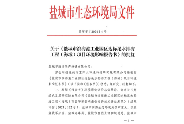 鹽城市濱海港工業(yè)園區(qū)達標尾水排海工程(海域)項目取得環(huán)評批復(fù)